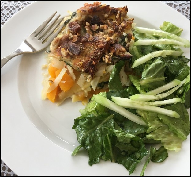 - Add 2 lasagna noodles and cover with half the kale, half the squash and a third of the remaining sauce. Repeat once.