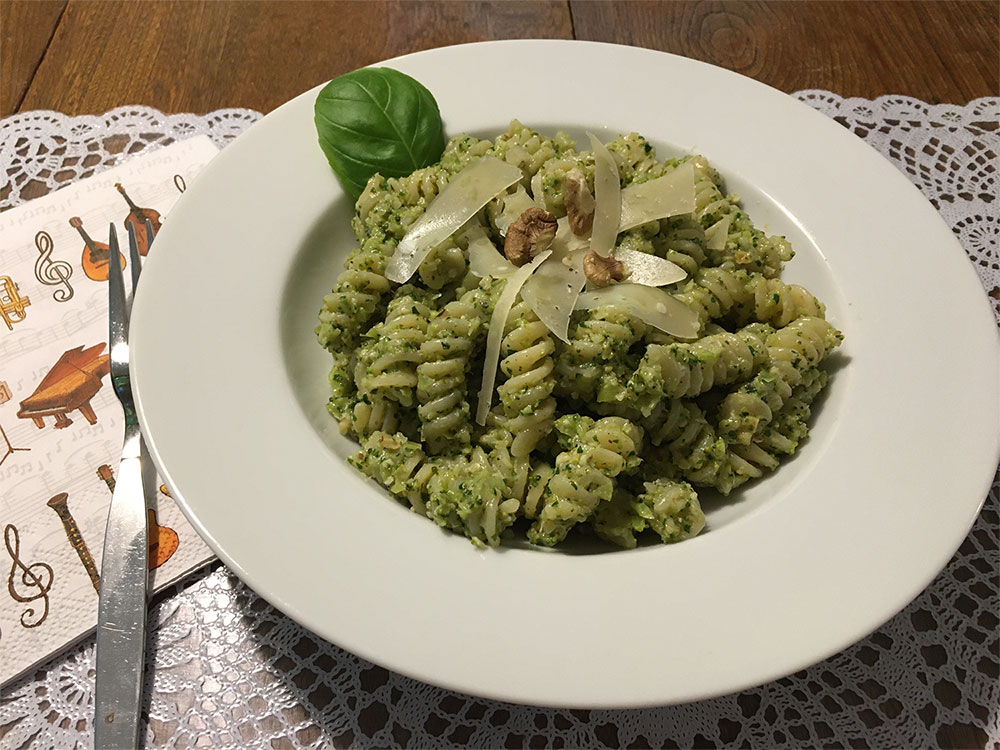 - Utiliser environ ½ tasse de pesto pour 225 g de pâtes. Si la texture est trop épaisse, ajouter de l’eau de cuisson des brocolis ou de l’eau des pâtes ou du jus de citron.